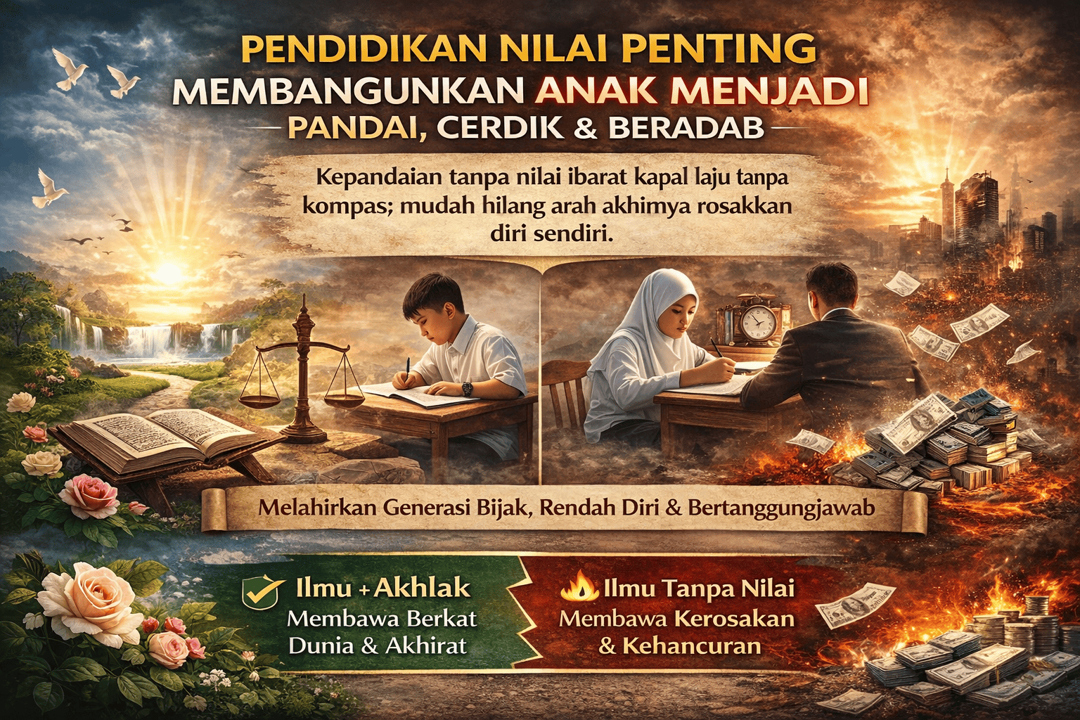 Ilmu dan kepintaran perlu disertai dengan akhlak, adab serta panduan nilai-nilai murni agar ilmu yang diperoleh dapat dimanfaatkan untuk kebaikan, bukan keburukan. Sebaliknya, apabila anak-anak dididik dengan nilai yang betul sejak kecil seperti kejujuran, tanggungjawab, kesederhanaan, rasa hormat, rendah diri dan tawaduk, maka kecerdikan mereka akan menjadi sumber manfaat besar kepada diri, keluarga, agama dan negara.